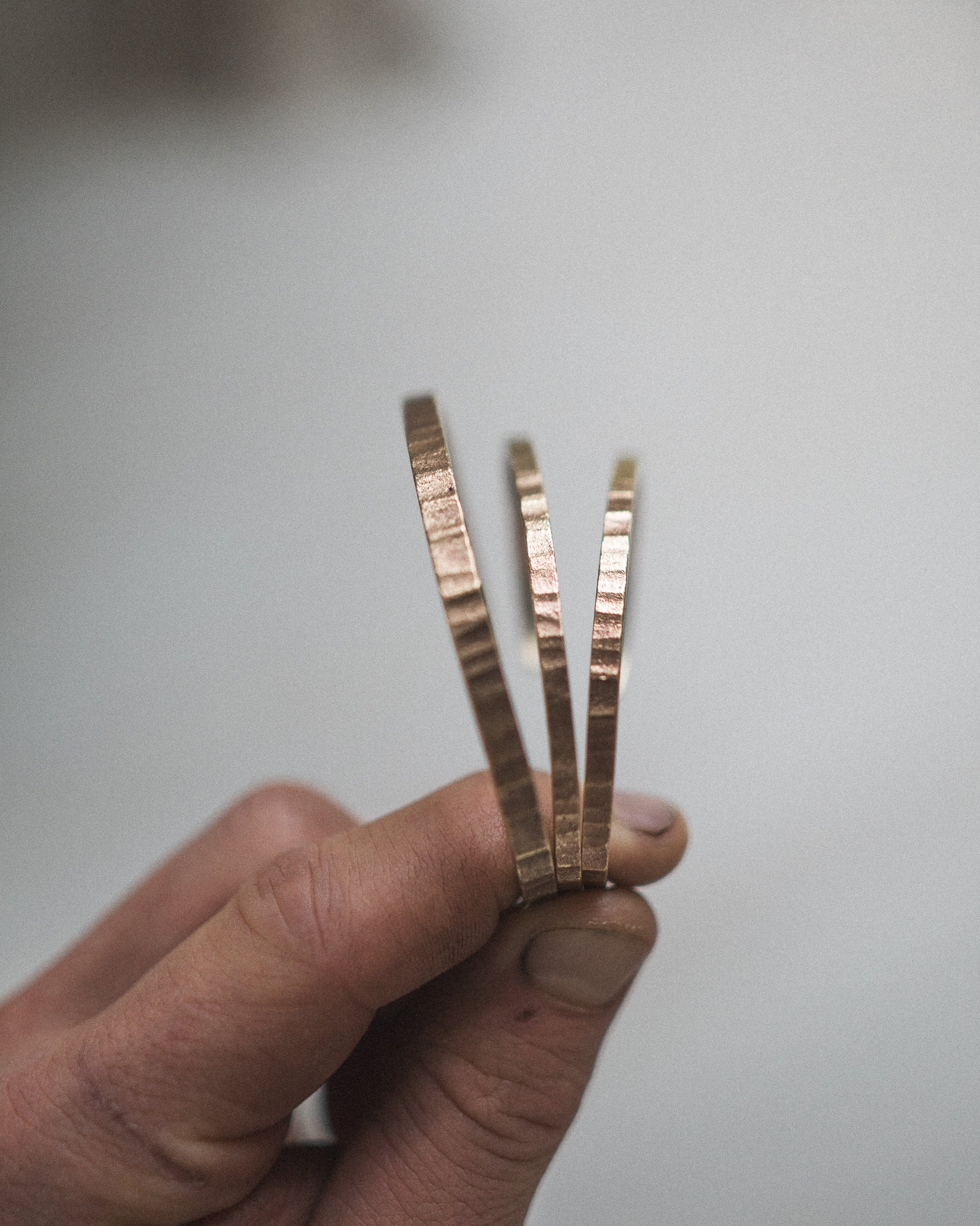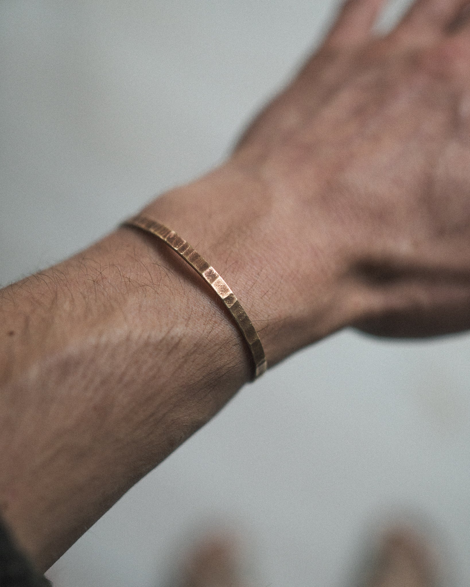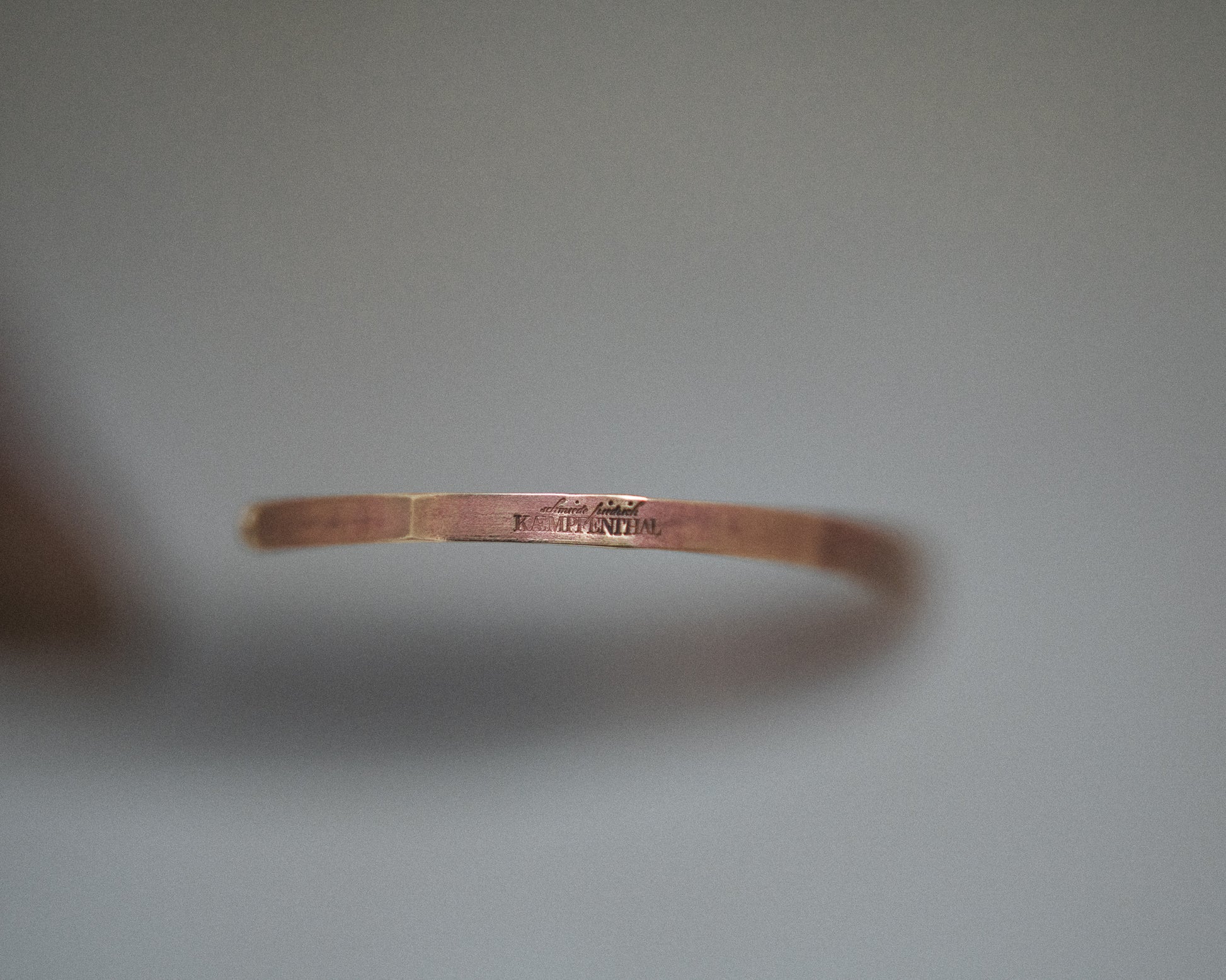 Eleganter Armreif, geschmiedet aus Messing, mit fein geriffelter Oberfläche.