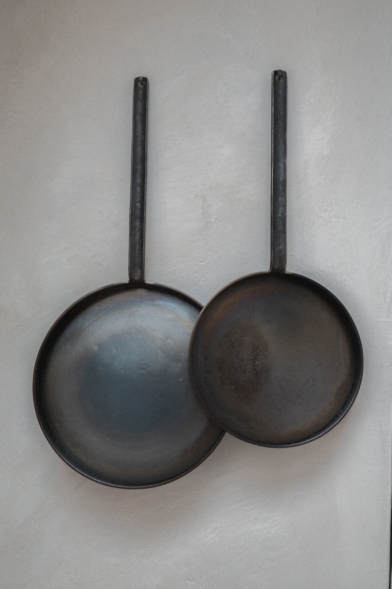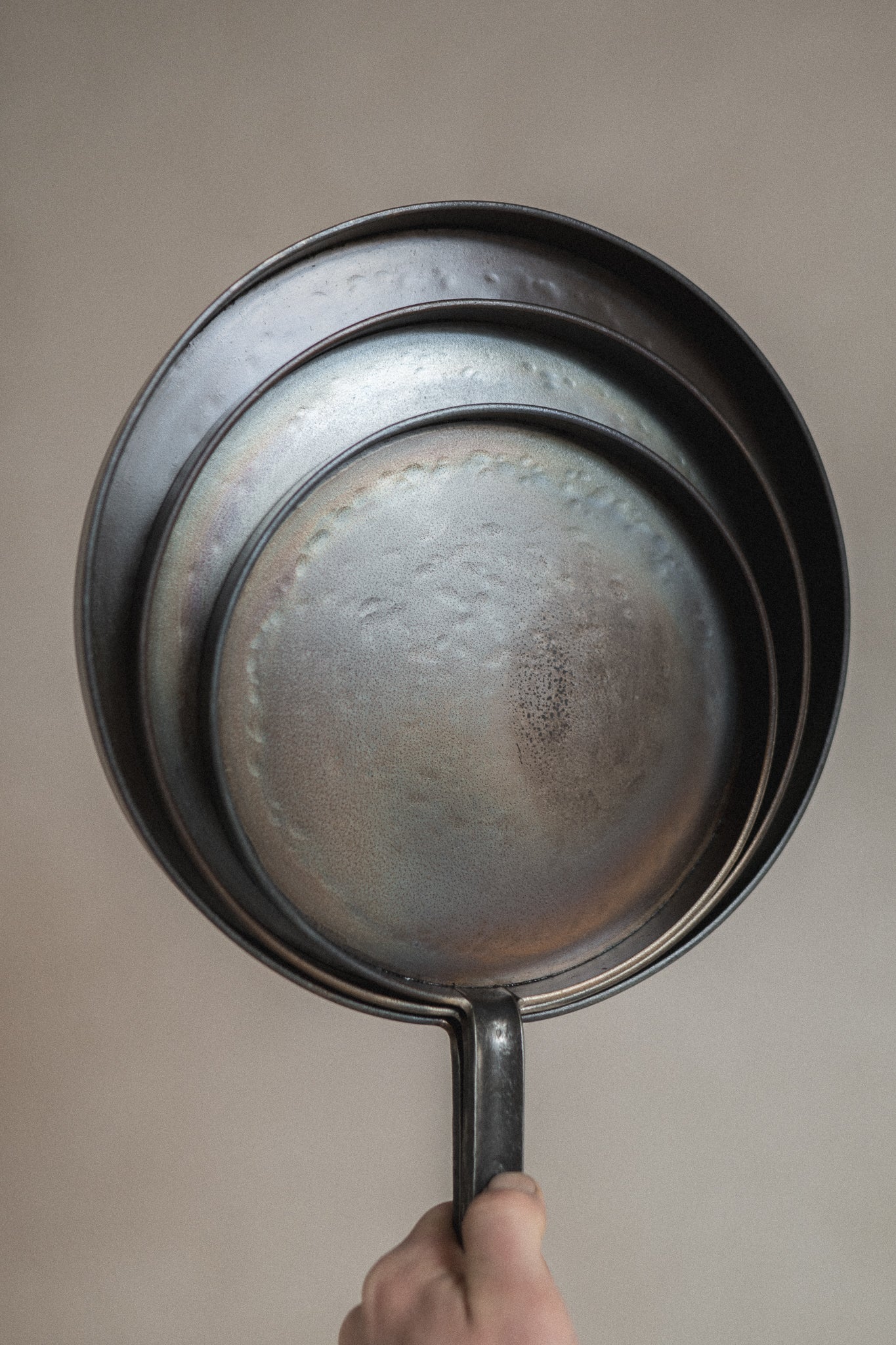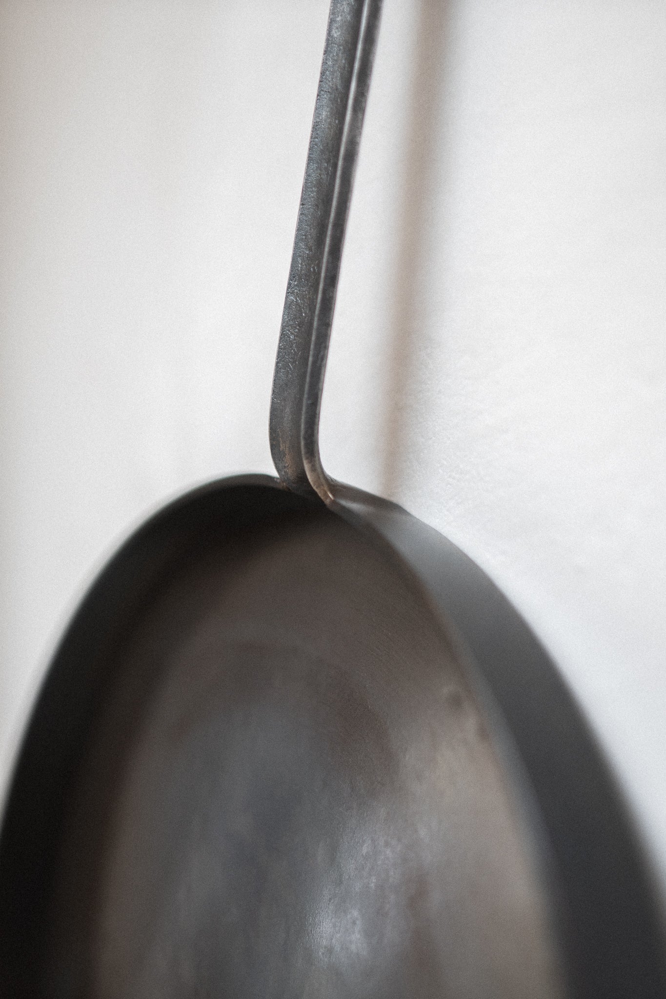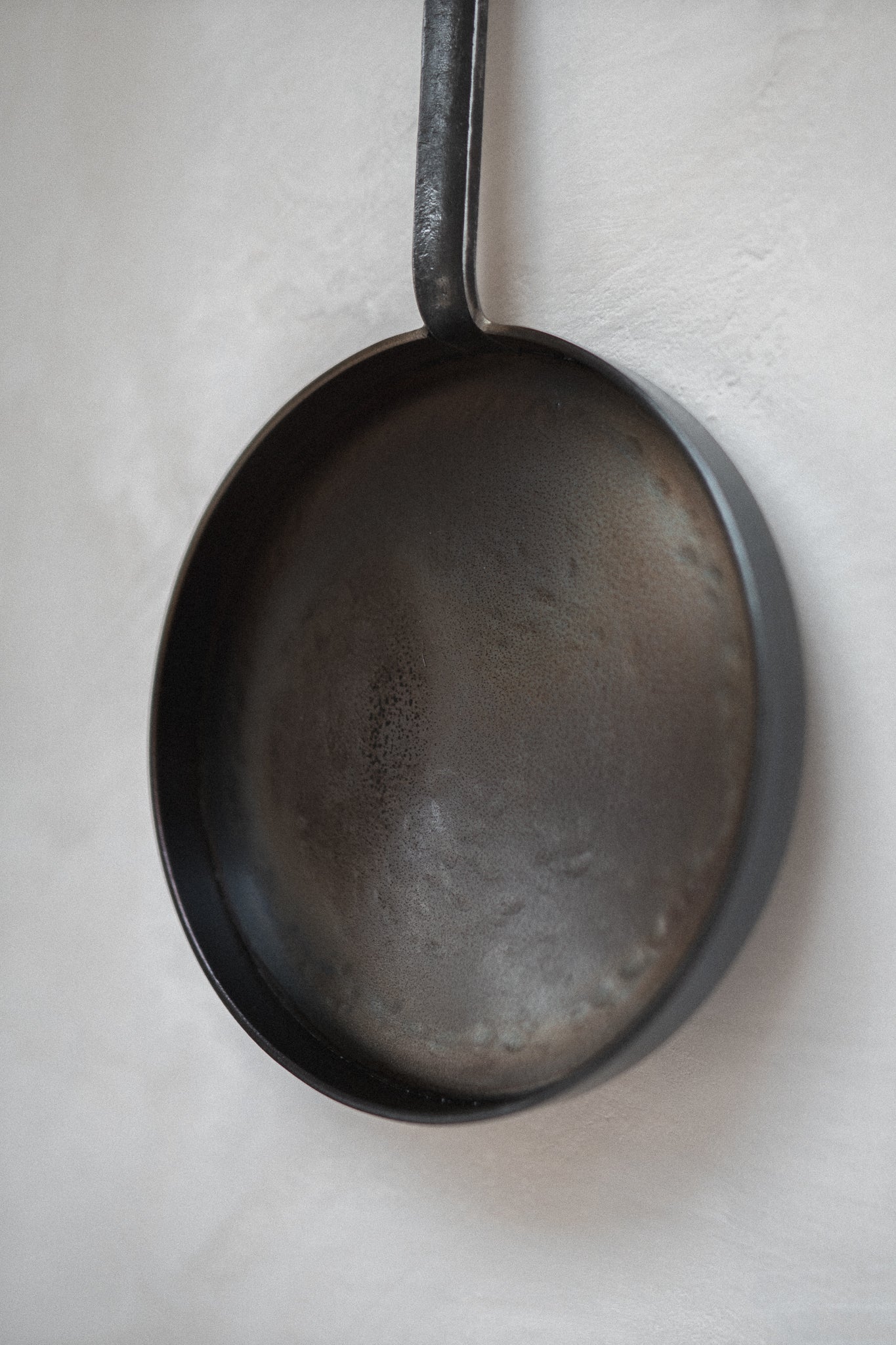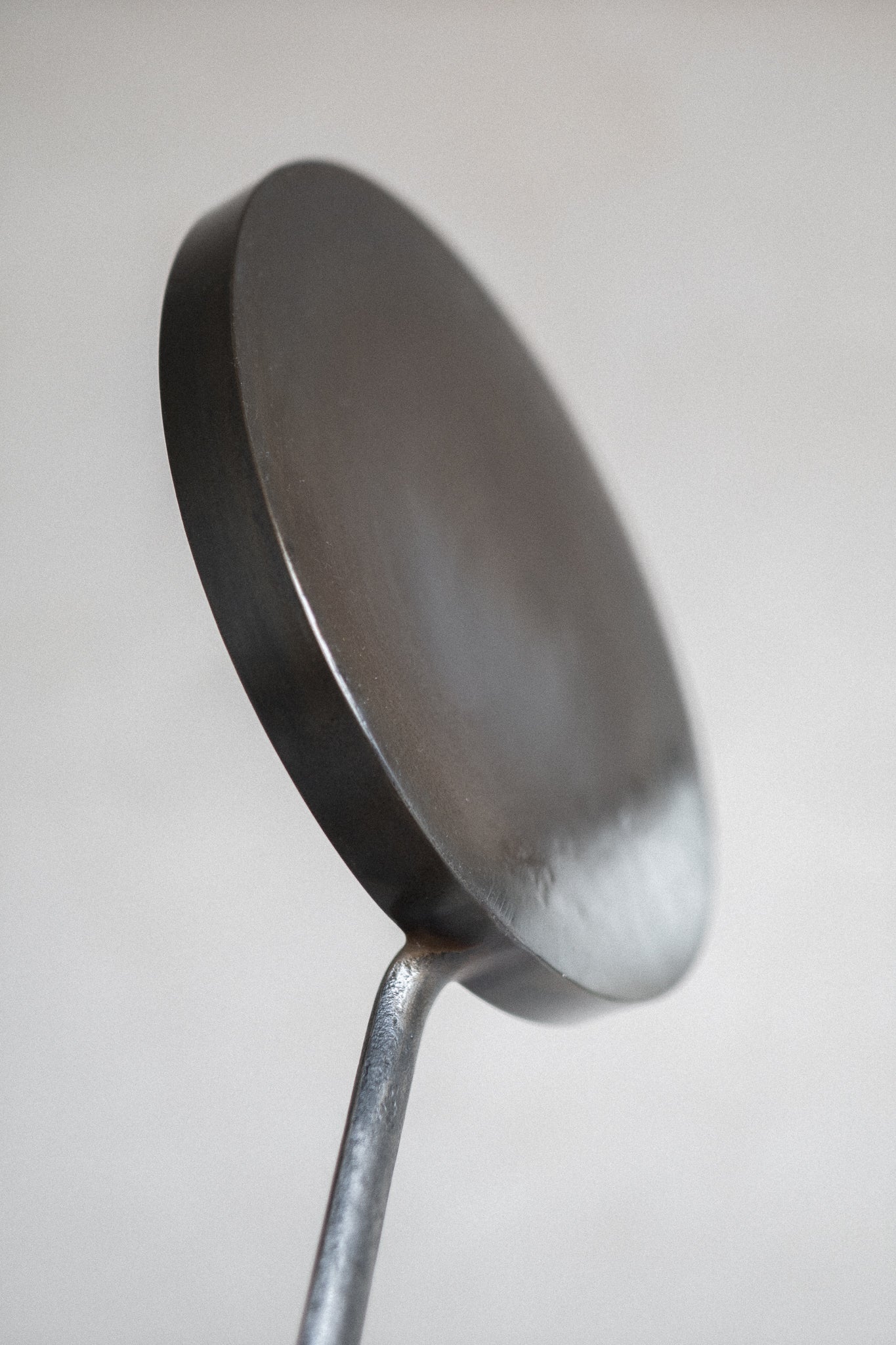 Geschweißte Bratpfanne in minimalistischer Form mit geschmiedetem Griff und senkrechtem Rand für maximale Flächennutzung.