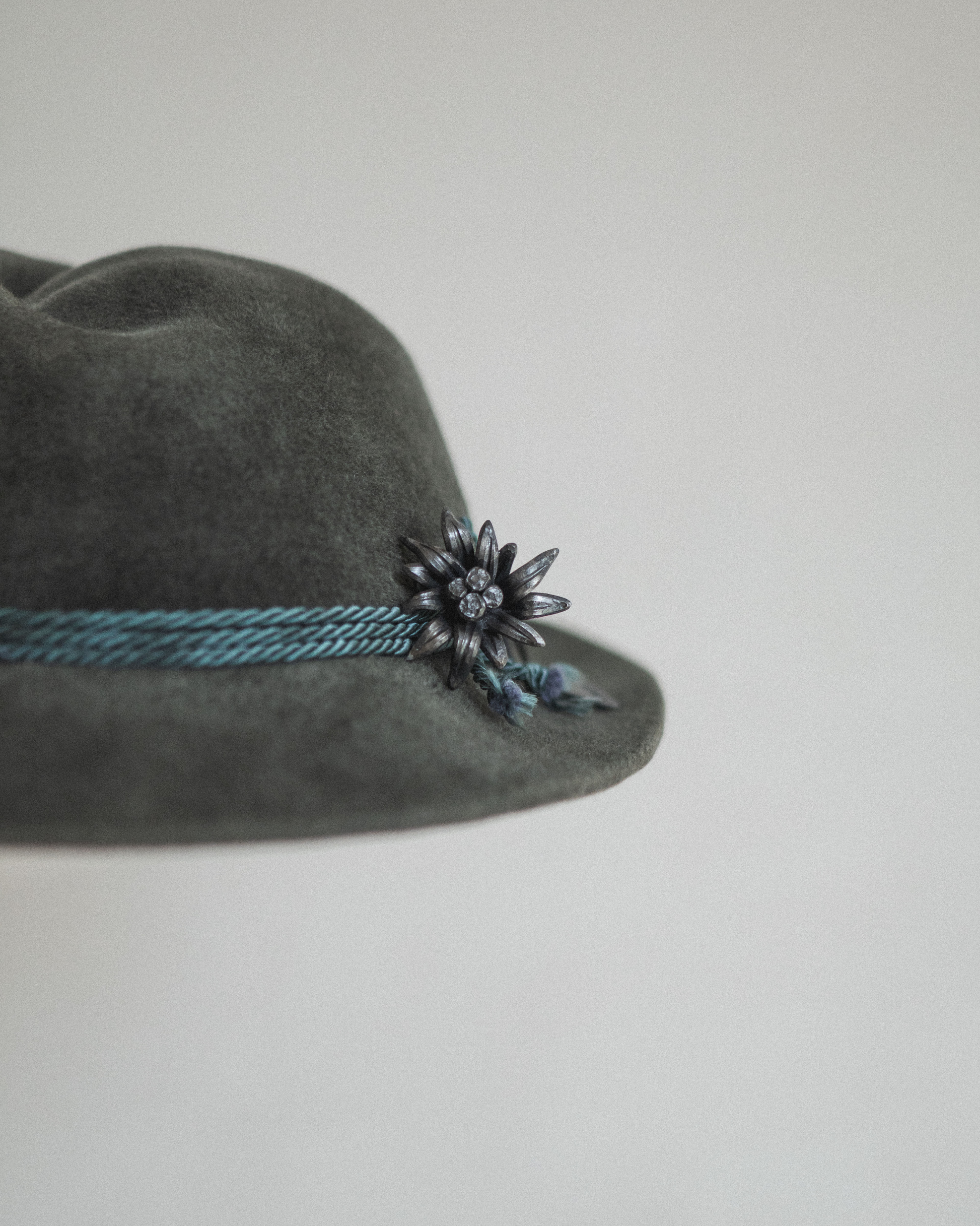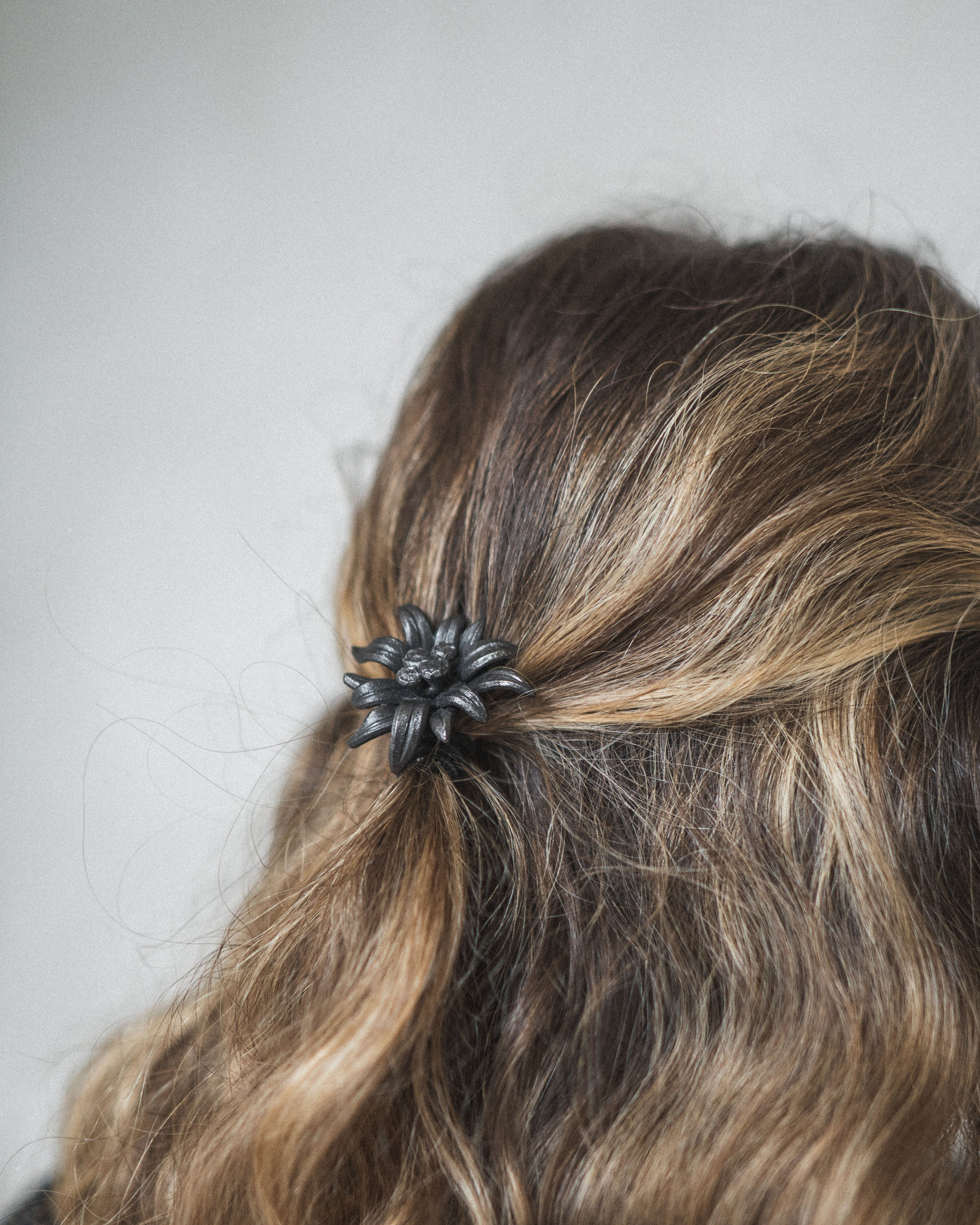 Naturgemäß fühlt sich das Edelweiß in großen Höhen wohl, warum es auch nicht verwundert, dass man es im Tal entweder schnitzen, oder eben schmieden muss. - Dunkler Zunder, der im Schmiedefeuer aus dem Stahl an dessen Oberfläche tritt, verleiht dem Accessoire diesen einzigartigen Charakter.
