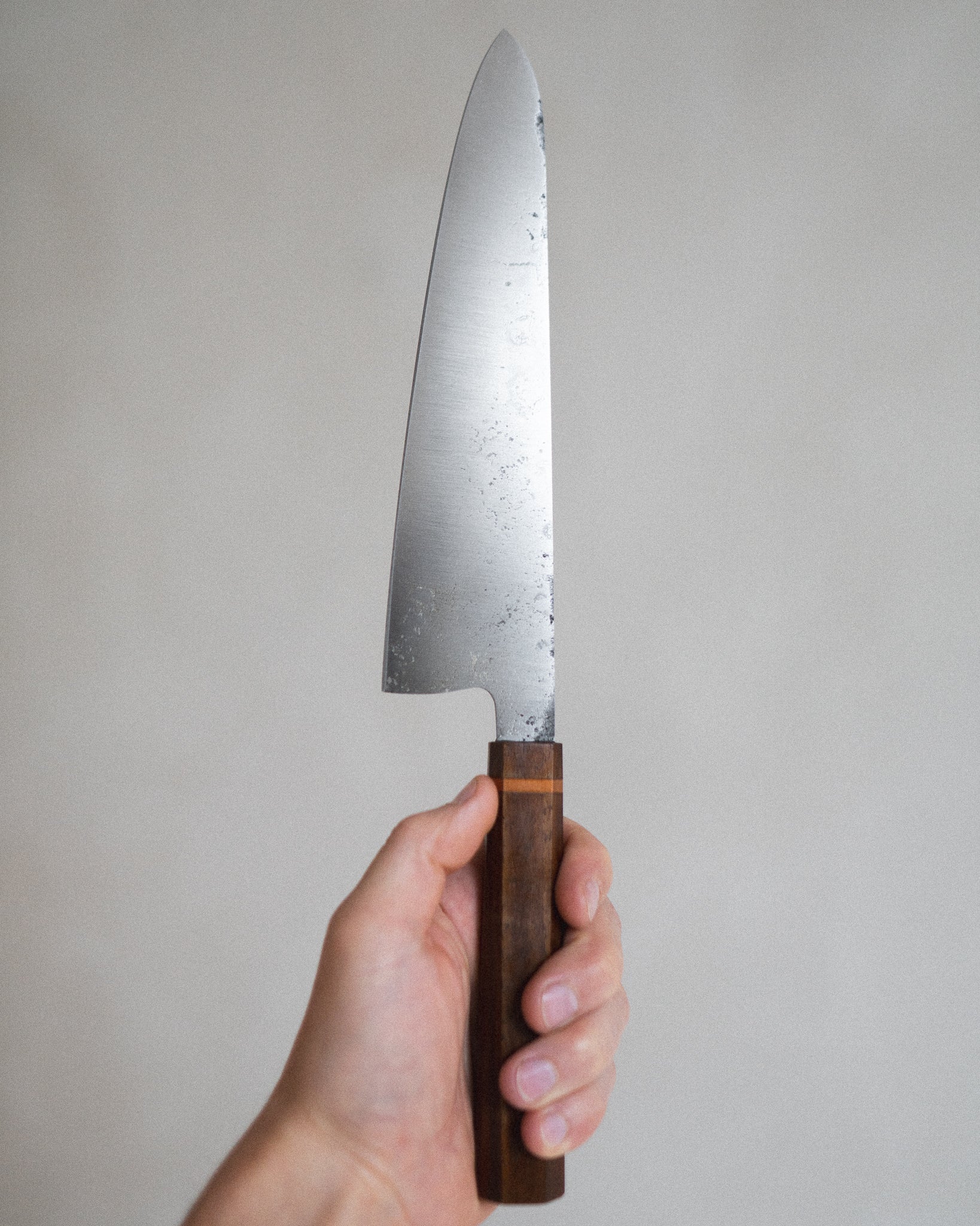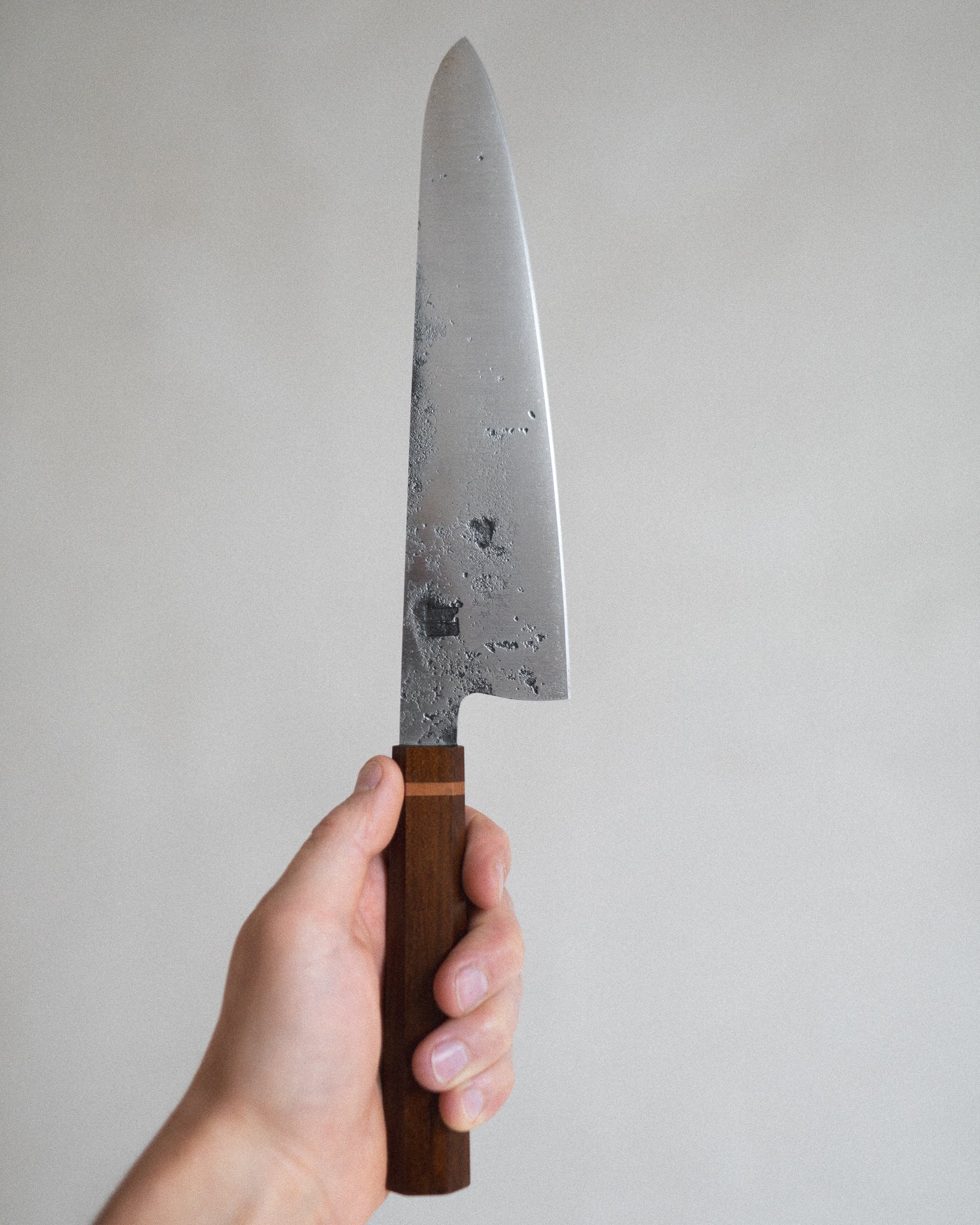 Geschmiedet aus einer Blattfeder, mit einem Griff aus Nußbaum-Holz mit Kupferdetail. Klingenlänge 23 cm.