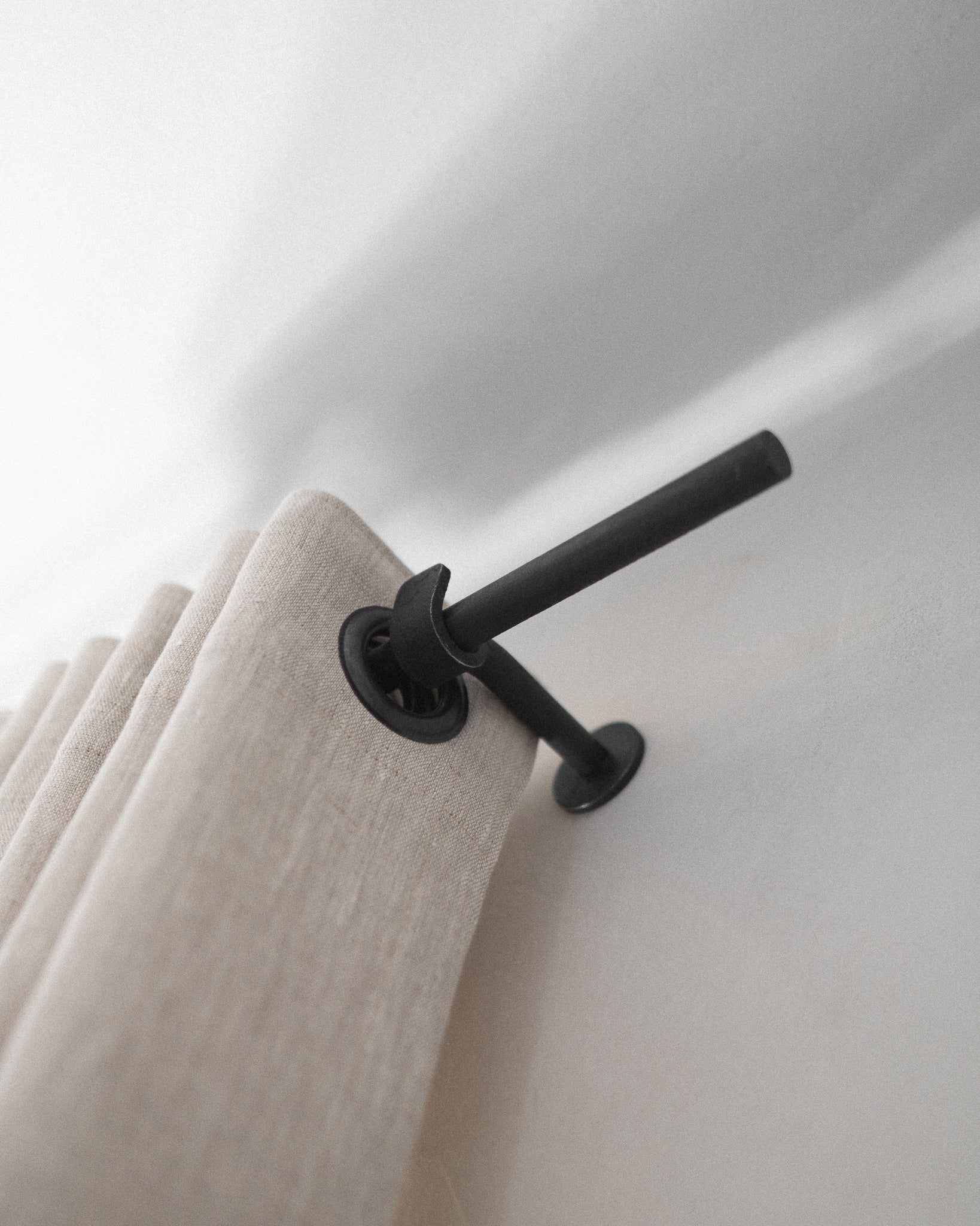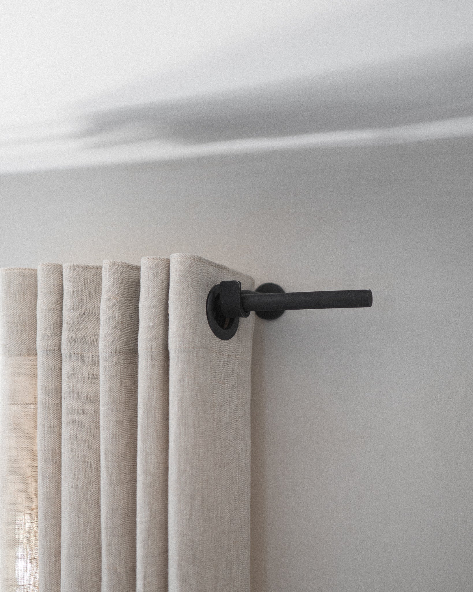 Eine Vorhangstange, die sich wie eine feine Linie durch den Raum bewegt - bestehend aus einem geschwärzten Rundeisen und geschmiedeten Haltern.